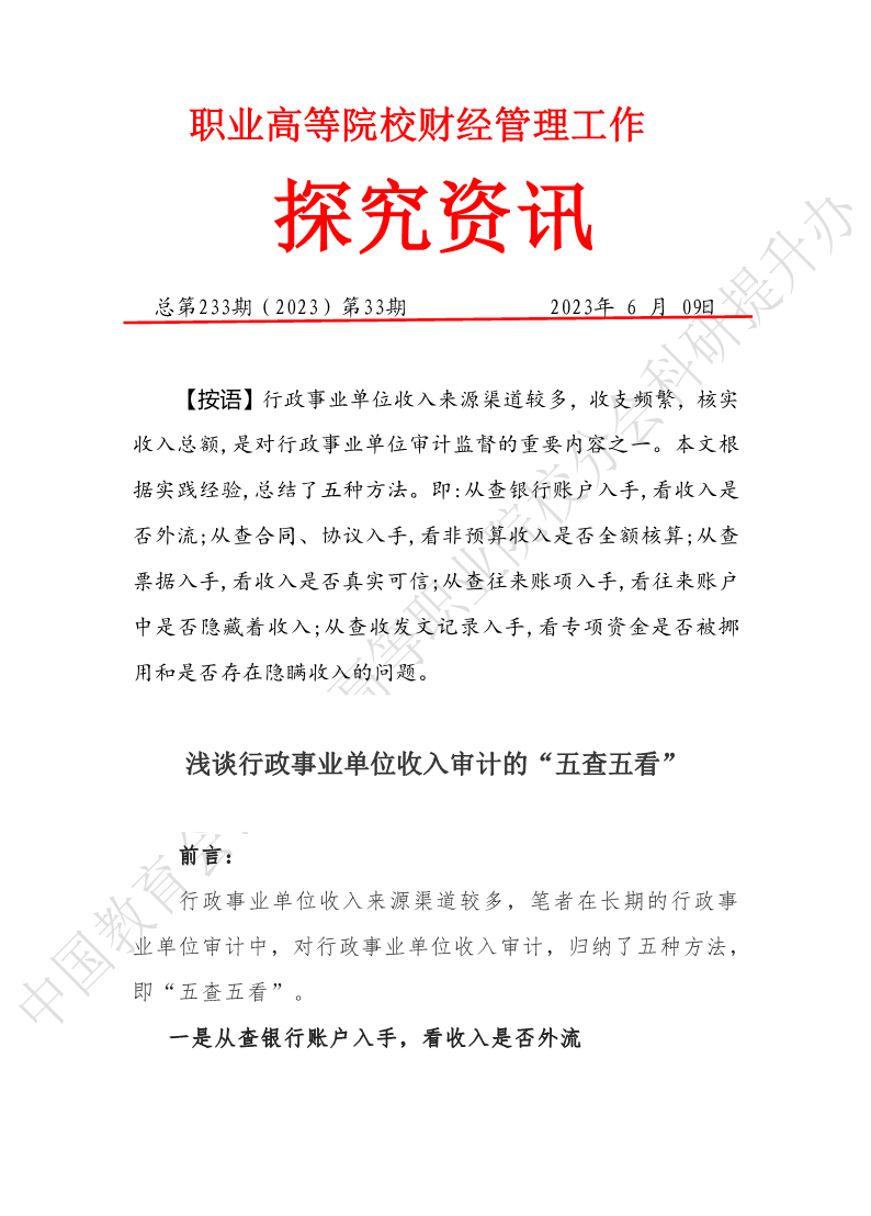 探究资讯233:浅谈行政事业单位收入审计的“五查五看”