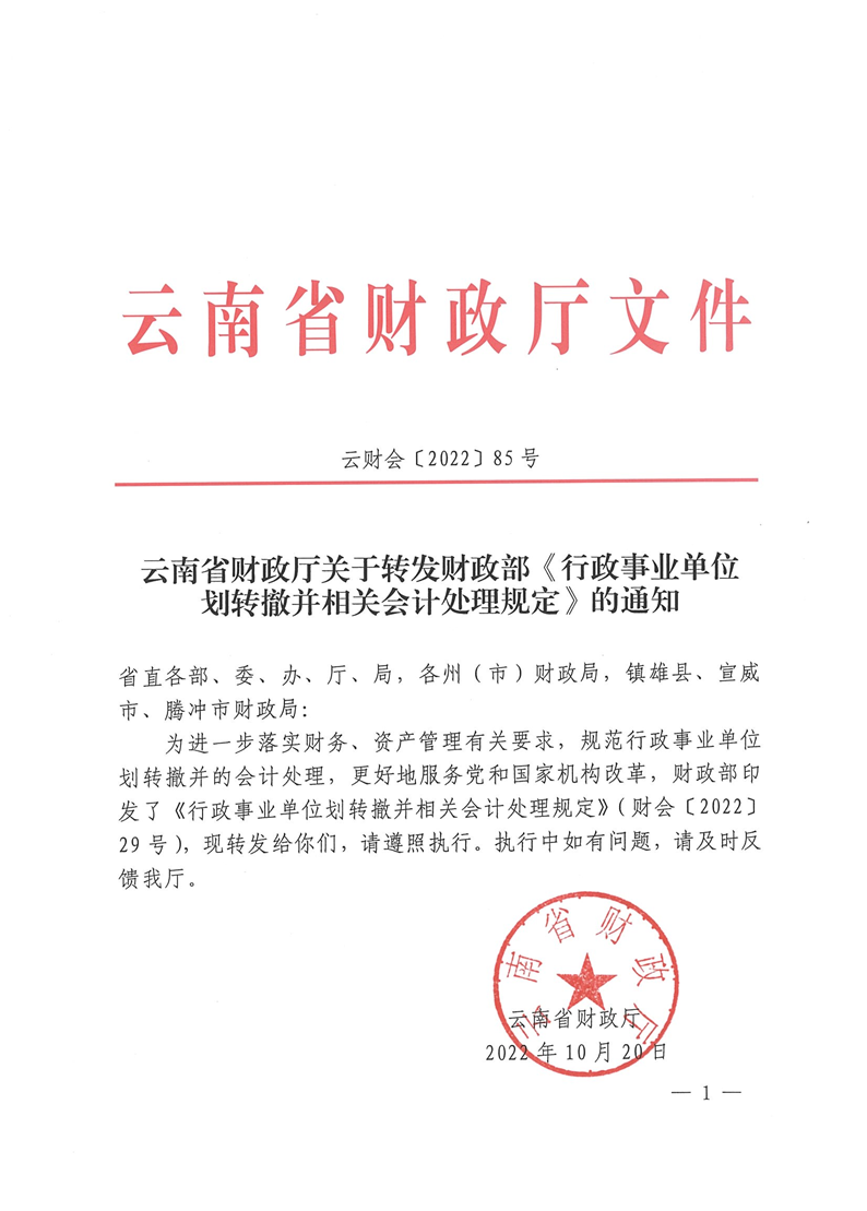 云南省财政厅关于转发财政部《行政事业单位划转撤并相关会计处理规定》的通知