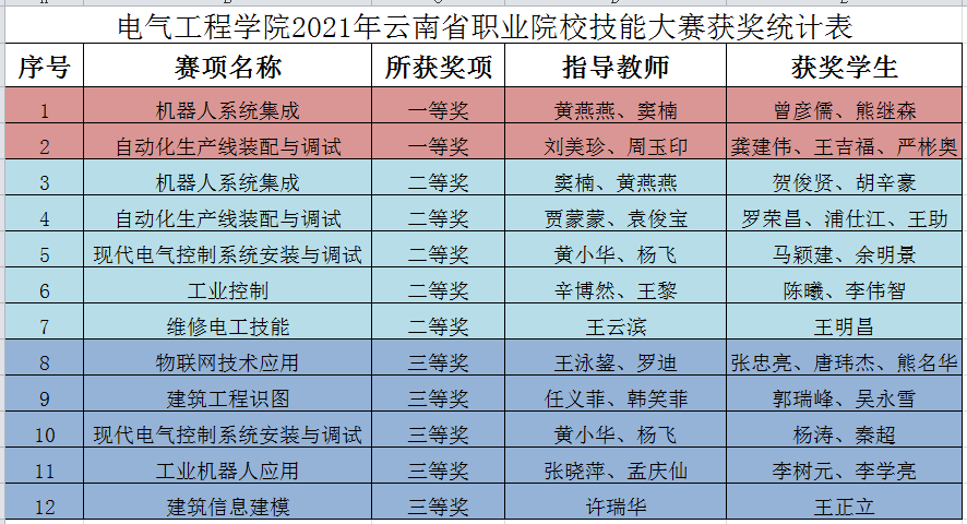 在2021年1月举行的云南省职业院校技能大赛中,电气工程学院参加了机器人系统集成、自动化生产线装配与调试、现代电气控制系统安装与调试、工业控制、维修电工技能、建筑工程识图、建筑信息建模、物联网技术应用、工业机器人共九个赛项,斩获了12项大奖。其中一等奖2项,二等奖5项,三等奖5项,10名指导教师、25名学生获奖,共计35人次获奖。值得注意的是,我院所参加的九个赛项中,均有所收获,再创我院技能大赛获奖新高。具体获奖名单如下: