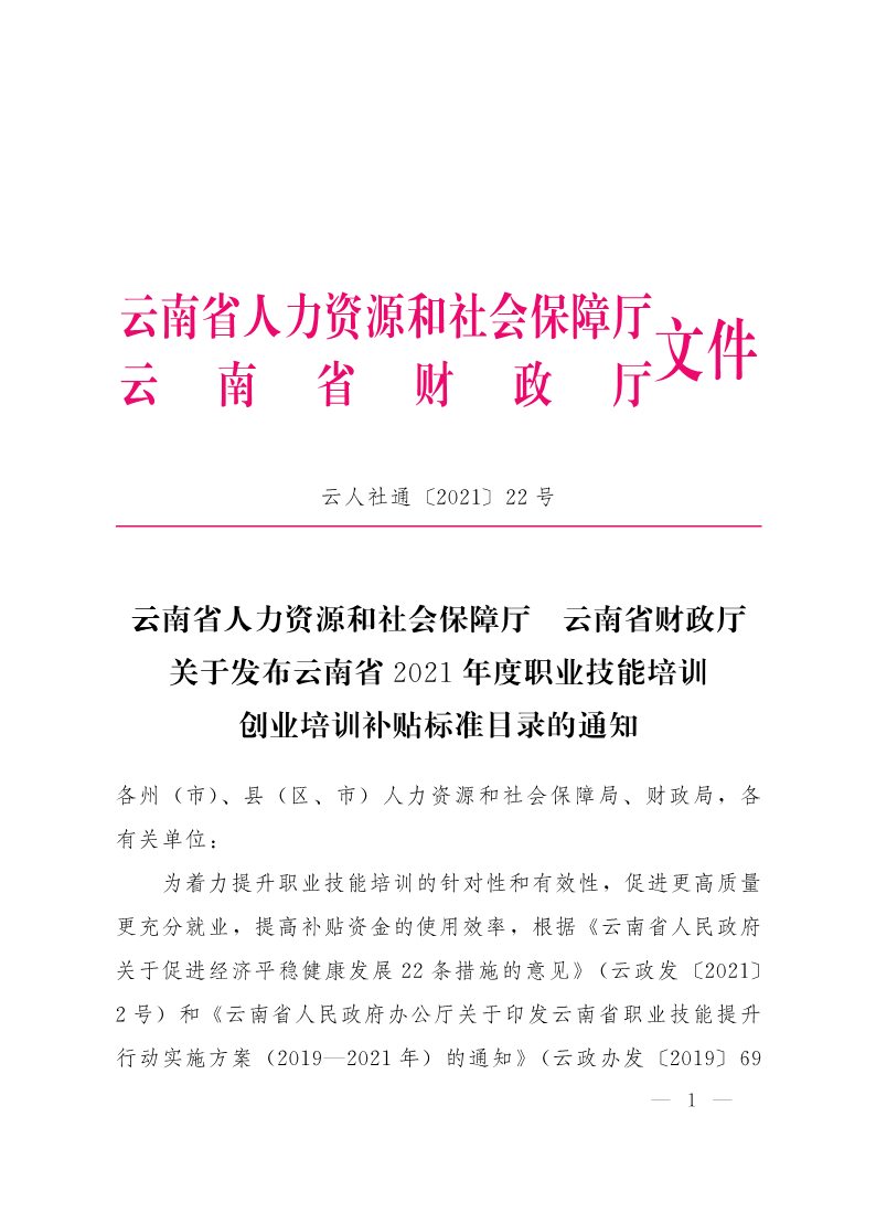 《云南省人力资源和社会保障厅 云南省财政厅关于发布云南省2021年度职业技能培训创业培训补贴标准目录的通知》(云人社通〔2021〕22号) 来源: 发布时间:2022-12-12 10:11:51 浏览次数: 次 【字体:小 大】 终审:姚忠 分享到: 【打印正文】