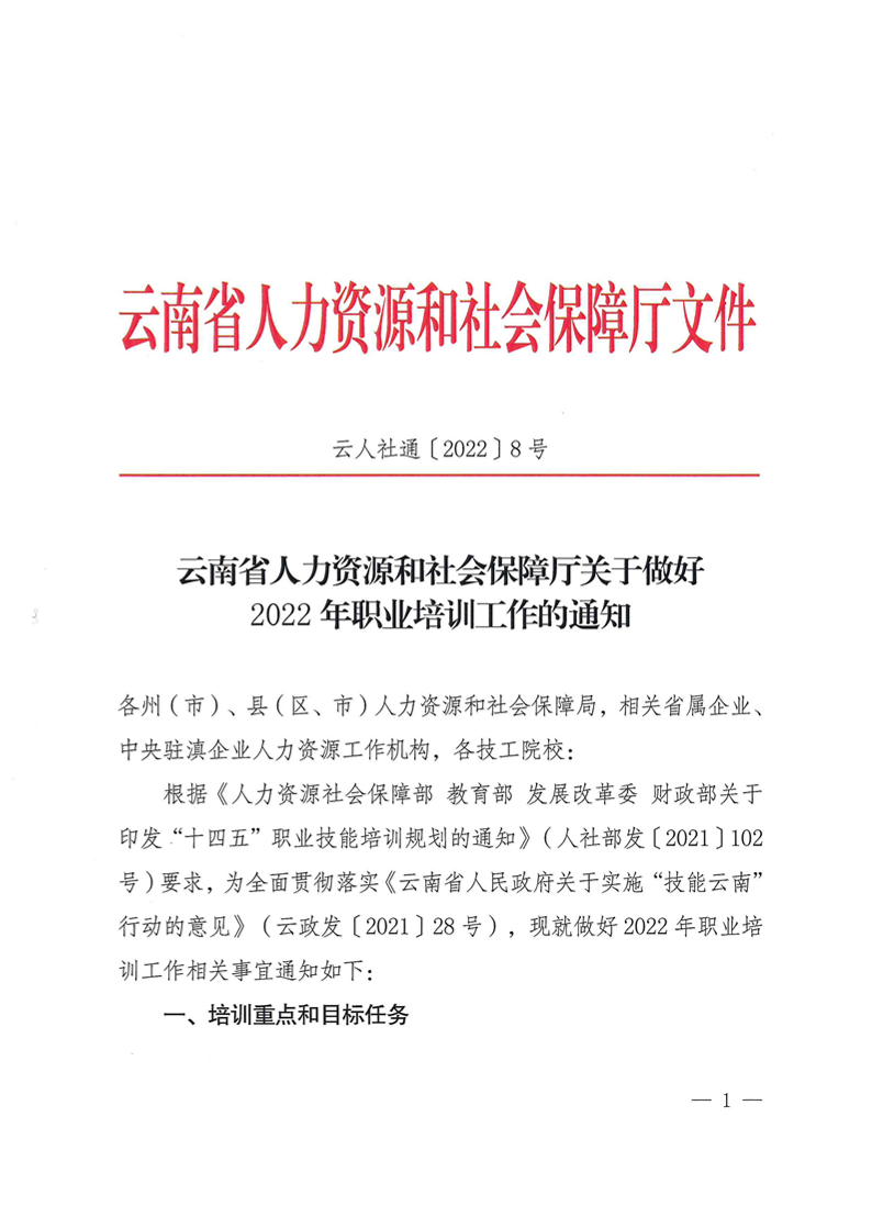 云南省人力资源和社会保障厅关于做好2022年职业培训工作的通知(云人社通〔2022〕8号) 来源: 发布时间:2022-12-12 10:17:04 浏览次数: 次 【字体:小 大】 终审:姚忠 分享到: 【打印正文】