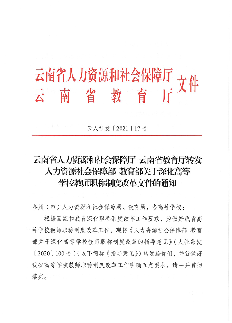 云南省人力资源和社会保障厅 云南省教育厅转发人力资源社会保障部 教育部关于深化高等学校教师职称制度改革文件的通知(云人社发〔2021〕17号) 来源: 发布时间:2021-11-22 14:31:09 浏览次数: 次 【字体:小 大】 终审:周明 分享到: 打印文章