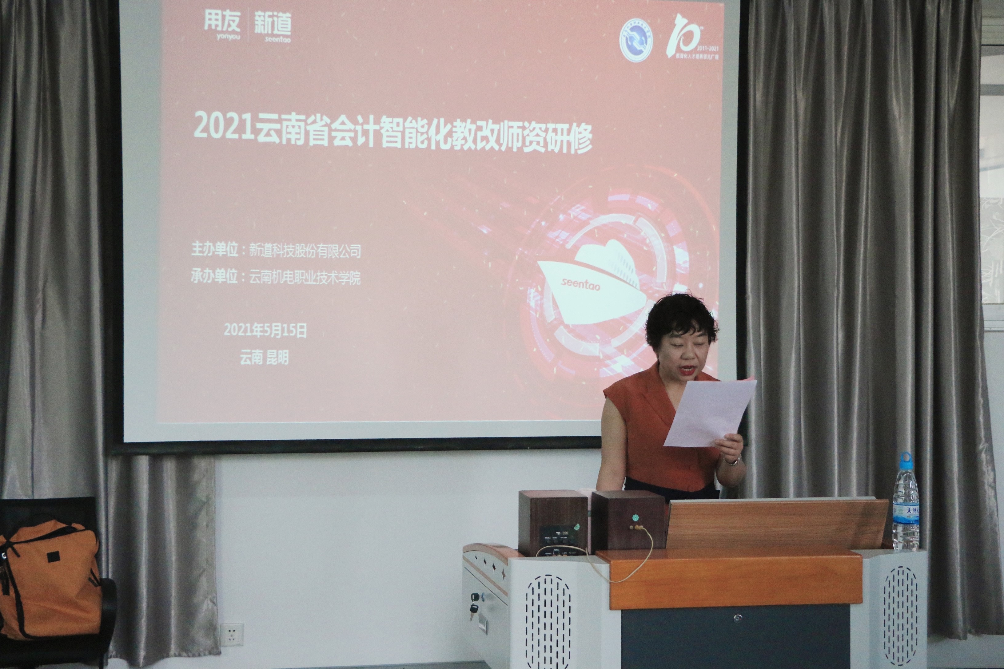 5月15日,由新道(用友)公司主办,经济与管理学院承办的会计智能化教学改革师资研修班在我院胜利开班。会上,我院党总支书记杨萍同志发言,向全体参会教师表示热烈的欢迎,并传达了《国家职业教育改革实施方案》、《职业教育专业目录(2021)年》等相关政策文件精神以及本次会议研修的必要性和前瞻性。