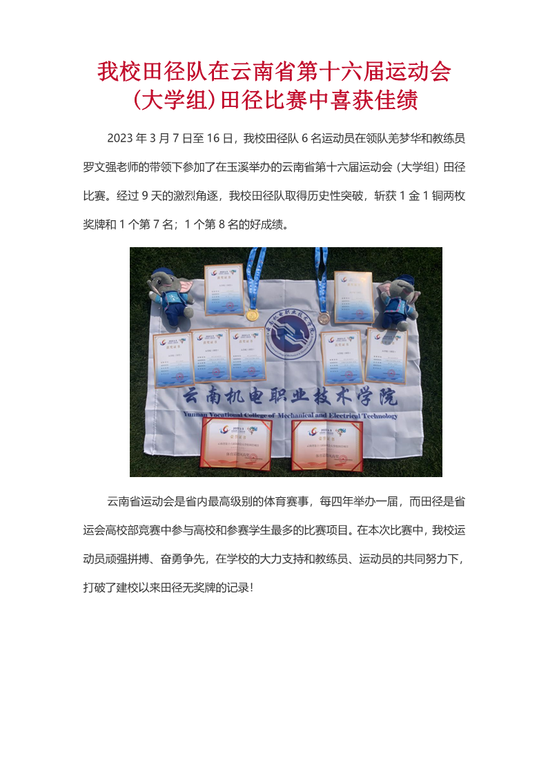 我校田径队在云南省第十六届运动会(大学组)田径比赛中喜获佳绩 来源: 发布时间:2023-03-22 09:55:18 浏览次数: 次 【字体:小 大】 终审:王福才 智能标签: 我校 田径队 云南省 第十六 运动会 相关内容 分享到: 【打印正文】