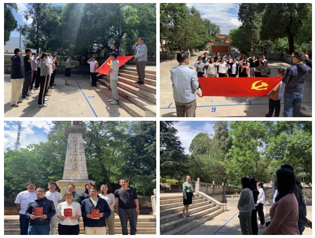 接着,由学院党总支书记李红同志领誓,全体党员佩戴党徽,举起右手、紧握拳头,重温入党誓词,铿锵有力的誓词提醒着每一名党员,恪守信念,勿忘使命,践行职责。并在红军纪念塔下为5月入党的党员同志集体过政治生日,发放生日贺卡,3位同志分别发表了感言,并集体合唱《没有共产党就没有新中国》《我的中国心》,表达了爱党、爱国的爱国主义情感。李红书记作了总结讲话,提出长征精神是中华民族百折不挠、自强不息民族精神的体现,通过回顾长征史、学习长征精神,我们更加深刻的感知长征是无数生命铸就的历史,我们要接过先辈的旗帜,永远记住这种信念不移、勇往直前、百折不挠、坚持不懈的精神,走好新时代的长征之路。机械工程学院的建设成果也是一代一代机械人艰苦奋斗的结果,我们要传承革命者的意志、立足岗位、服务师生、弘扬奋斗精神,走好机械工程学院建设和发展的“长征”之路。