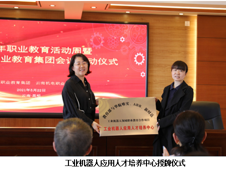 2021年5月22日上午,云南机电职业教育集团会议在我校召开,会上进行了教育部与华航唯实、ABB、新时达工业机器人领域职业教育合作项目“工业机器人应用人才培养中心”授牌。2016年6月,国家教育部与北京华航唯实机器人科技有限公司、上海ABB工程有限公司和上海新时达机器人有限公司签署《工业机器人领域职业教育合作备忘录》,支持上述3家公司(统称实施方)在工业机器人领域发挥优势,促进职业院校相关专业创新技术技能人才培养模式改革,提高专业内涵建设水平,提升教师科研及技术服务能力。本项目由实施方结合产业结构特点,择优与全国相关职业院校合作建设90余个 “工业机器人应用人才培养中心”。2017年1月机械工程学院申报的工业机器人应用人才培养中心项目获国家教育部立项,正式成为全国“工业机器人应用人才培养中心”建设单位之一。