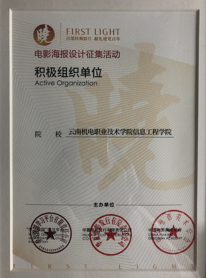为展现中国共产党的百年风华,将“课程思政”融入教学实践,信息工程学院师生积极参加了由中共中央宣传部“学习强国”学习平台、华夏电影发行有限公司、中国电影美术学会联合主办的“‘晓’百部经典影片献礼建党百年”电影海报征集活动,喜获“积极组织单位”奖。